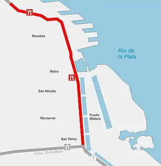 It runs between Alicia M. de Justo, Ingeniero Huergo, Eduardo Madero, Antártida Argentina, and Ramón Castillo Avenues, through the barrios of Recoleta, Retiro, Puerto Madero, San Nicolás, Monserrat, San Telmo within the city of Buenos Aires. The freeway lanes are truck and bus only.[2]
