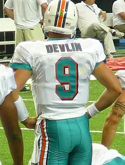 Devlin was signed by the Miami Dolphins as an undrafted free agent on July 26, 2011.[31] He was waived after the preseason, but signed with the team's practice squad.[32] He was promoted to the team's active roster on December 20.[33] In the 2012 season, he remained the Dolphins' third-string quarterback by beating out David Garrard,[34] and in the 2013 season, he made the 53-man team, after wide receiver Marvin McNutt was released.[35] During the Dolphins' 2014 preseason, Devlin injured his hamstring, and on August 11, 2014, he was waived in favor of signing Brady Quinn.[36]