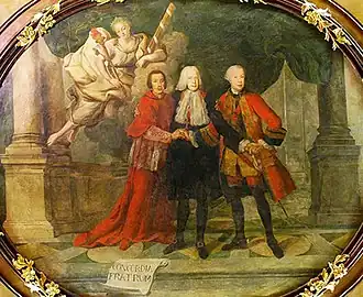 Sebastião José Carvalho e Melo, Marquis of Pombal, with his brothers Paulo de Carvalho e Mendonça and Francisco Xavier de Mendonça e Furtado. Ceiling of the Hall of Concord of the Palace of the Marquis of Pombal, Oeiras. Painted in the 18th century. Artist unknown.
