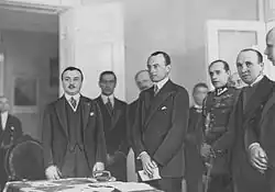 Despite his pro-British and pro-French feelings, Paul believed in the aftermath of the remilitarization of the Rhineland that Yugoslavia needed to tilt its foreign policy towards Germany.[26] Likewise, the Hoare–Laval Pact of 1935 and British attempts to improve Anglo-Italian relations such as the "Gentlemen's Agreement" of 1937 and the Easter Accords of 1938 caused Paul to believe the British were willing to sacrifice Yugoslavia for the sake of better relations with Italy.[26] Stojadinović, who openly admired Fascist Italy and Nazi Germany, made a major diplomatic push with the tacit support of the Prince Regent for better relations with the fascist states in the winter of 1936–37.[27]