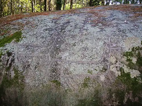The zoomorphic motifs are scratched into the side of a large solitary rock and depict two animals, possibly goats. Each animal has six legs, which might have been a deliberate choice to represent movement in the figures.[1] The engravings have been tentatively dated to the Neolithic.