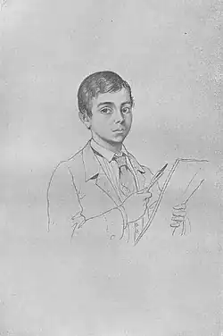 Pedro Américo drew very well and soon the fame of the little prodigy spread throughout the city. When a scientific expedition arrived there in 1852, its organizer, naturalist Louis Jacques Brunet, went to visit him and was able to appreciate a series of copies of classic works made by the boy, who was not yet ten years old. Wanting to test him to prove the skill that was claimed, Brunet got some objects and had Pedro Américo draw them in his presence; Américo was able to reproduce them with great resemblance. Impressed, Brunet decided to hire Américo as the expedition's draftsman, so the little artist accompanied the Frenchman on a twenty-month trip across much of northeastern Brazil.[1] In 1854, at the age of eleven, provided with several letters of recommendation, Américo was admitted to the Imperial Academy of Fine Arts, in Rio de Janeiro, but could not join immediately. Before that he spent a season at Pedro II College studying Latin, French, Portuguese, arithmetic, drawing and music, standing out among his colleagues for his dedication and intelligence. His letters to his family reveal a student aware of his responsibilities, and he already had a desire, still uncertain, to dedicate himself to historical painting.[3][4]