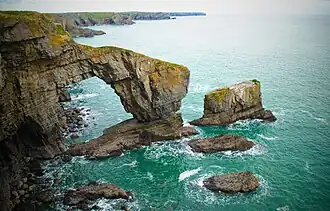 The geology of the area is of particular interest with many good exposures both inland and along the coast, exhibiting a variety of rock types and structural features such as natural arches, stacks, rock folding and sea caves. A stack of note is Elegug Stacks (Creigiau Elegug), two large detached pillars of limestone which in the spring provide valued nesting sites for razorbills and guillemots.[3] In the north, the rocks of Carn Llidi, Pen Beri and Garn Fawr, together with the extensive moorland on Mynydd Carningli and Mynydd Preseli, give an exposed and mountainous feel to the landscape, cut through by the wooded valleys of the Gwaun and Nevern. In the west, the National Park is dominated by the broad sweep of St Bride's Bay, bounded at its northern end by Ramsey Island, near St David's peninsula, and at its southern end by Skomer. The southern coast is another contrast, with the limestone plateau and cliffs of the Castlemartin peninsula, the steep-sided wooded valleys inland from Amroth; the Bosherston lakes — now, like much of the coastal strip, in the care of the National Trust — and the tourist resorts of Tenby and Saundersfoot. Between the western and southern areas of the National Park lies the Milford Haven waterway, where the tranquil Daugleddau estuary feeds into one of the finest natural deep water harbours in the world.[4]