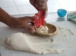 Pempek is the best-known of Palembang's dishes.[3] Its origin is undoubtedly Palembang. However, the history behind the creation of this savoury dish is unclear. Traditional folklore connects it with Chinese influences. Some suggests that pempek probably originated from ancient kelesan, a steamed dish made of the mixture of sago dough with fish flesh, dated as early as Srivijayan era circa 7th century CE.[4] Sago flour might be extracted from the trunk of sago palm or aren palm.