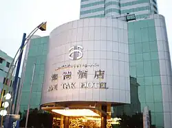 • Hoi Tak Hotel (Chinese: 海德酒店; Uyghur: خەيدې مېھمانخانىسى, romanizedHeydë Mëhmanxanisi) is a 32-storey five-star hotel on the west side of the Square[2]
