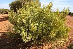 Persoonia coriacea shrub on road verge, near Yellowdine WA