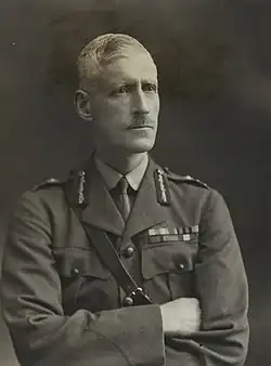 He served in the First World War as commanding officer (CO) of the 1st Battalion, Manchester Regiment from 1914 and, promoted in January 1915 to the temporary rank of brigadier general,[4] as commander of the Jullundur Brigade, leading it at the Battle of Neuve Chapelle and at the Second Battle of Ypres.[2] He was promoted in February to brevet colonel[5] and continued his war service as commander of the 98th Infantry Brigade from late 1915 and then, after being promoted to temporary major general in June 1916,[6] was general officer commanding (GOC) of the 1st Division on the Western Front from 1916 until the end of the war, leading it at the Battle of the Somme in 1916 and the Battle of Lys two years later.[3] In January 1918 his rank of major general became permanent.[7]
