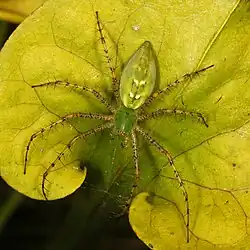 Peucetia viridans, the green lynx spider, is a bright-green lynx spider usually found on green plants. It is the largest North American species in the family Oxyopidae. This spider is common in the southern U.S., Mexico, Central America, and in many West Indies islands, especially Jamaica. Lynx spiders are hunters specialized for living on plants. This species does not use a web to capture its prey. It pounces on its prey in a cat-like manner, which is the reason for the name lynx. It is active during the day.