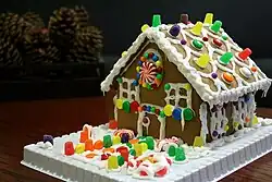 A gingerbread house is a novelty confectionery shaped like a building that is made of cookie dough, cut and baked into appropriate components like walls and roofing. The usual base material is crisp gingerbread, hence the name. Another type of model-making with gingerbread uses a boiled dough that can be moulded like clay to form edible statuettes or other decorations. These houses, covered with a variety of candies and icing, are popular Christmas decorations.