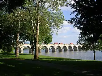 The Philadelphia & Reading Railroad Bridge carries Norfolk Southern rail lines across the Susquehanna River between Lemoyne, Pennsylvania and Harrisburg, Pennsylvania. Some of its concrete piers encase stone masonry piers from an earlier truss bridge on this site, completed in 1891 by the Philadelphia, Harrisburg and Pittsburgh Railroad, which was then acquired by the Philadelphia and Reading Railroad to connect its Harrisburg and Lurgan lines. The current structure was constructed from 1920 to 1924 by replacing the trusses with concrete arches one track at a time.[1] The bridge has fifty-one concrete arches, three more than the nearby Rockville Bridge.