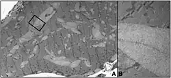 Glycogen deposits in the muscle of a human patient, shown by electron microscopy. The presence of this excess glycogen in muscle tissue is a result of phosphofructokinase deficiency.[18]