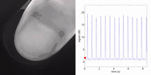 Remote photoplethysmography can also be performed by digital holography, which is sensitive to the phase of light waves, and hence can reveal sub-micron out-of-plane motion. In particular, wide-field imaging of pulsatile motion induced by blood flow can be measured on the thumb by digital holography. The results are comparable to blood pulse monitored by plethysmography during an occlusion-reperfusion experiment.[22] A major advantage of this system is that no physical contact with the studied tissue surface area is required. The two major limitations of this approach are (i) the off-axis interferometric configuration that reduces the available spatial bandwidth of the sensor array, and (ii) the use of short-time Fourier transform (via discrete Fourier transform) analysis that filters-off physiological signals.