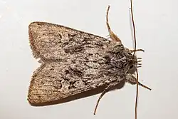 The wingspan of the adult male is between 32 and 41 mm whereas the female is between 38 and 40 mm.[1] This species is almost identical to P. cucullina with the only difference between the two species being the male antenna.[1] The male antennae of P. funerea have indistinct appressed ciliations where as P. cucullina have distinct erect ciliation.[1] P. funerea can appear similar to specimens of P. sequens, but the later species tends to have a prominently underlined kidney-shaped mark nearer to the outer edge of the forewing, in contrast to P. sequens.[1]