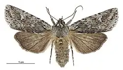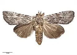 ♂, 31 mm.; ♀, 34 mm. Head and thorax grey, strongly crested. Antennae filiform. Abdomen ochreous grey, crests slight. Forewings bright grey, irrorated with fuscous. A jagged subbasal line, strongly marked on submedian fold, where it turns abruptly towards base. A dark line across wing at 13, double, space between double lines grey (not irrorated), a dark mark on costa at 12, followed by two more above reniform. Subterminal line faint and suffused. A terminal series of black points; a few dark points outline veins. Orbicular faint, but with a well-defined line along lower edge. Reniform defined by a dark line below and on terminal edge. Cilia grey, mixed with fuscous. Hind -wings brown, darker towards termen. Cilia brown, with fine paler line at base. Tips grey-white.[3]
