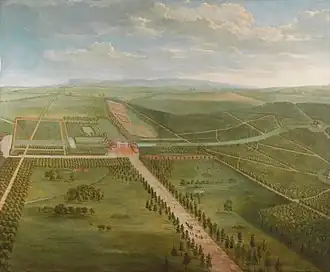 He also established a reputation with his topographical landscapes and portraits of country houses and gardens. He made two series of paintings of Chiswick House and Gardens upon the commission by Lord Burlington.[3] The purpose of the paintings was to serve as a reminder to Lord Burlington of the progress of the work on the Palladian villa and its setting, which Burlington had designed himself. Work on Chiswick House and Gardens had commenced in 1717 and was completed in 1729. The paintings were probably displayed in Lord Burlington's various other properties such as Burlington House and at his Yorkshire country seat.[5] The series of paintings had an important influence on the fashion for sets of garden views that emerged in the second quarter of the 18th century and gained further popularity with the rise of the picturesque movement.[3]