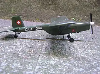 The first company proposal to the Swiss Air Force was a single-seat trainer, designated the P-1, although no records exist of the work done on it and not even the name of the project was ever mentioned[10] on the two drawings that were discovered in the federal archives.[11] The next project was the detail construction of the SB-2 Pelican which had been designed by the Swiss Federal Institute of Technology.[12] The five-seat experimental aircraft first flew on 30 May 1944 and only one of the type was built - resulting in a financial loss for the company that was higher than what it was ever paid for.[13]