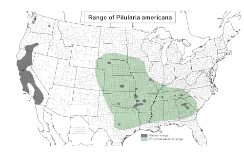 The range of the American pillwort is well-established throughout much of California and south-central Oregon. However, mostly only local occurrences have been found elsewhere in eastern North America. It is uncertain whether this reflects a genuinely sporadic occurrence, or whether this is a reflection of the fact that this is a small, grasslike, extremely easily overlooked plant. Close examination is often necessary to ascertain that this is a Pilularia. The species also occurs through Central and South America, although scientific investigation may confirm those plants to be a separate species, P. mandoni A. Braun.