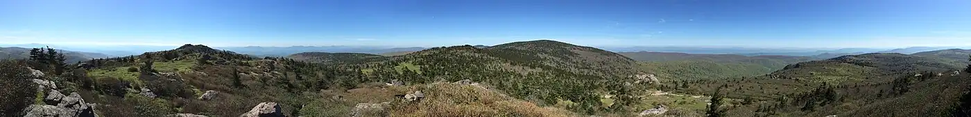 Pine Mountain is a mountain in the Blue Ridge Mountains. It is located in the Mount Rogers National Recreation Area of the Jefferson National Forest, within Grayson County, Virginia, United States.[1] The peak is immediately east of the highest mountain of Virginia, Mount Rogers, and Pine Mountain's sparsely vegetated summit has excellent views of both Mount Rogers and the surrounding region. The Appalachian Trail passes within feet of the summit.[2] Pine Mountain is the second highest named summit in Virginia, though because its topographic prominence is well under 300 feet, it is considered a subsidiary peak of Mount Rogers.