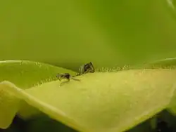 A fly trapped on a butterwort leaf. Glandular hairs are visible.