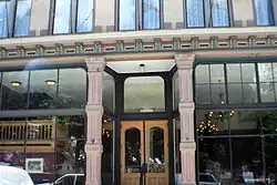 By 1882 the town's population had grown to six thousand.[2] The Plaza Hotel was built that year by a group of businessmen led by Don Benigno Romero.[3] The local merchant Carlos Blanchard was among the partners.[4] Construction cost $25,000.[5] The Plaza is a three-story brick building with an Italianate facade.[3] The hotel was grandly decorated, with high-ceilinged guest rooms. The lobby was connected to the second floor by towering twin staircases.[6] The first floor balcony had ornate iron railings, since removed.[7] It was advertised as the finest hotel in the territory.[8] The Plaza was often called the "Belle of the Southwest".[3]