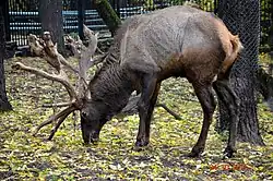 In September 2010, 6 male muskox from Wrangel Island were reintroduced,[6] but 2 muskoxen died in the first months: one from unknown causes, and the other from infighting among the muskoxen.[37][23][38] Seven months later, in April 2011, 6 Altai wapiti and 5 wisents arrived at the park, the wapiti were from the Altai Mountains and the wisents from Prioksko-Terrasny Nature Reserve, near Moscow.[39][40] The enclosing fence proved too low for the wapiti, and by the end of 2012 all 6 had jumped the fence and run off.[41]