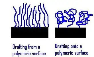 Grafting, in the context of polymer chemistry, refers to the addition of polymer chains onto a surface. In the so-called 'grafting onto' mechanism, a polymer chain adsorbs onto a surface out of solution. In the more extensive 'grafting from' mechanism, a polymer chain is initiated and propagated at the surface. Because pre-polymerized chains used in the 'grafting onto' method have a thermodynamically favored conformation in solution (an equilibrium hydrodynamic volume), their adsorption density is self-limiting. The radius of gyration of the polymer therefore is the limiting factor in the number of polymer chains that can reach the surface and adhere. The 'grafting from' technique circumvents this phenomenon and allows for greater grafting densities.