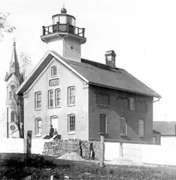 Requests for a lighthouse for the harbor were first presented to Congress in 1845, and in 1848 $3,500 was appropriated for construction.[4] This light was completed in 1849 and consisted of a tower and separate keeper's house, both constructed of Cream City brick.[5] The tower was somewhat over 35 feet (11 m) tall and was equipped with an array of five Lewis lamps with 14-inch (360 mm) reflectors. It was lit for the first time on May 8, 1849.[4][5] In 1856 a sixth-order Fresnel lens was installed. This lamp was 36 feet (11 m) from the ground and 109 feet (33 m) above the water.[5]