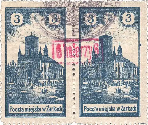A local postal service briefly operated in the Polish town of Żarki during the month of October 1918. Postage stamps were issued, in one design but in three denominations denoted by different colouring. A set of forgeries was made in 1928. The stamps, both genuine and forged, have attracted philatelic attention.