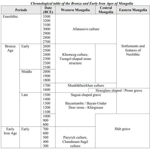 Chronological table of the Bronze and Early Iron Ages of Mongolia.[1]