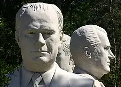 The park had financial troubles and was closed on September 30, 2010.[4] Creditors put the park up for auction (not including the busts) on September 28, 2012, after a foreclosure auction originally scheduled for April 26, 2012 was cancelled without explanation.[5] By January 10, 2013, the busts had been moved to private storage at a nearby local farm in Croaker, Virginia by Howard Hankins.[6] In 2017, National Geographic showcased a video in which Mr Hankins expresses a hope to rehabilitate the statues for a park in the future.[7][8] However, many of the presidential heads sustained damage in the move and are currently in a state of disrepair due to being out in the open elements. The 400-acre Croaker farm where the 20-foot busts are located are only accessible to the public during pop-up tours the owner holds throughout the year.