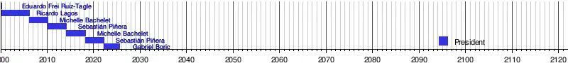 The timeline shows changes, both personal or title, of the head of state and the head of government of the Republic of Chile from 18 September 1810 until today, regardless of whether president, vice-president, supreme director, interim or junta.