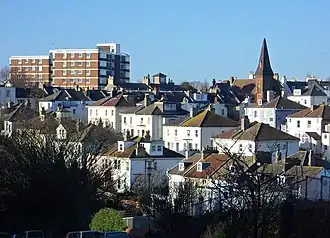 The ancient parish of Preston, a 1,300-acre (530 ha) area of arable land cut through by the valley of the Wellesbourne, was the first parish north of both Hove and Brighton.[7] Old Shoreham Road, now a major route through the southern part of Prestonville, formed the boundary.[5] St Peter's Church (the old parish church) and Preston Manor were on the east side of the valley. The western boundary was formed by Dyke Road, which led to Devil's Dyke on the South Downs. Preston parish became part of the parliamentary borough of Brighton and Hove in 1868 and was added to the municipal borough of Brighton five years later as Brighton's urban development spread northwards,[7] encouraged by its "rapid growth as Britain's premier seaside resort".[8] Prestonville's development contributed to an increase in population in Preston parish from 756 at the time of the 1841 census to 2,470 30 years later.[9]