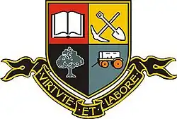 Coat of arms of the school, with motto: Latin: Virtute et Labore; English: "Through Courage and Labour".