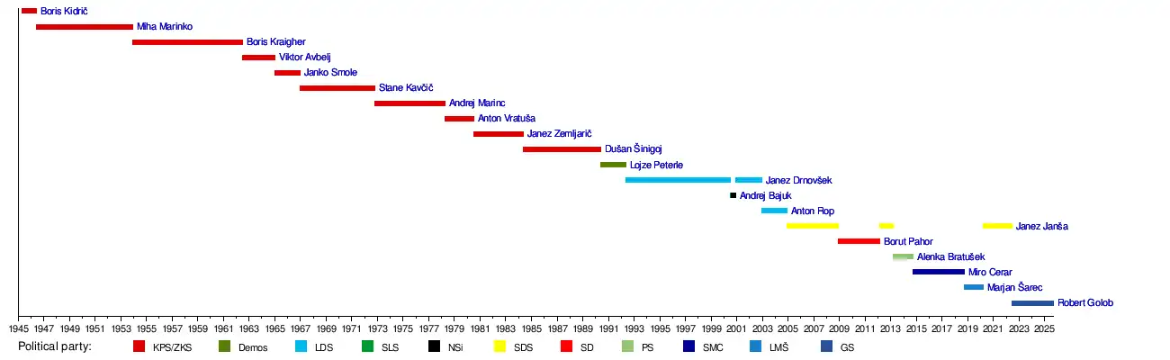 The prime minister of Slovenia, officially the president of the Government of the Republic of Slovenia (Slovene: Predsednik Vlade Republike Slovenije), is the head of the Government of the Republic of Slovenia. There have been nine officeholders since the country gained parliamentary democracy in 1989 (as well as two between 1945 and 1953, when the office was renamed "President of the Executive Council").
