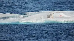 Polar bear on an ice floe in Franklin Strait east of Prince of Wales Island in September 2019; the bloody trail shows its prey was dragged over the floe.