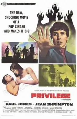 Privilege is a 1967 British musical science fiction comedy-drama film directed by Peter Watkins, starring English singer Paul Jones and model Jean Shrimpton.[2] It tells the story of a famous popstar, Steven Shorter, who is used as a tool by the state to divert people from political activity, and keep the population in check. It was produced by John Heyman. Johnny Speight wrote the story, and Norman Bogner wrote the script.
