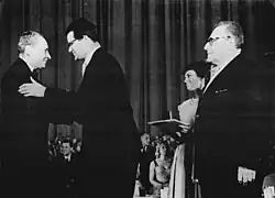 Sergei Yutkevich greets Konrad Wolf and Wolfgang Heinz during the Moscow Film Festival.