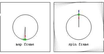 Similarly, an object undergoing physical or proper acceleration ao will be seen by observers in a frame rotating with angular velocity ω to have coordinate acceleration: In the equation above, there are three geometric acceleration terms on the right-hand side. The first "centrifugal acceleration" term depends only on the radial position r and not the velocity of our object, the second "Coriolis acceleration" term depends only on the object's velocity in the rotating frame vrot but not its position, and the third "Euler acceleration" term depends only on position and the rate of change of the frame's angular velocity.