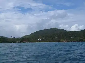 Isla de Providencia, the adjacent Santa Catalina island, and four smaller islands lie within a wide lagoon surrounded by a massive coral reef. They are the visible part of a stratovolcano that rises from the sea floor, extinct for the last four million years. The total area of the islands is 18 square kilometres (6.9 sq mi). Providencia is 6.5 by 4 kilometres (4.0 by 2.5 mi). Santa Catalina island to the north is 1.5 by 1.25 kilometres (0.93 by 0.78 mi).[2] Providencia has a central peak 360 metres (1,180 ft) high, from which spines run down to the sea enclosing fertile valleys. Temperatures are around 29 °C (84 °F) all year. Easterly trade winds are normal during all seasons, bringing the most rain in the autumn. Summers are relatively dry. The surrounding coral reefs make the approach difficult for those who do not know the waters.[3] The two larger islands were once one, called Santa Catalina by the Spanish, but some time between 1635 and 1641, the colonists cut a neck of land between them to make a secure retreat on what is now the small island of Santa Catalina.