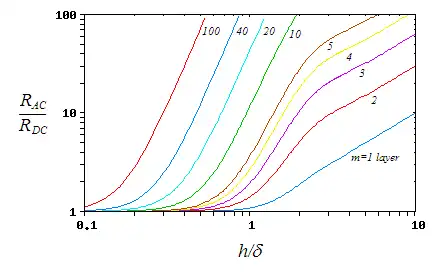 The ratio of AC to DC resistance for a portion of a strip winding at different frequencies (δ is Skin depth). It can be seen that increasing the number of layers dramatically increases the resistance at high frequencies.