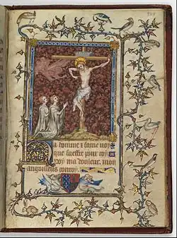 The book was commissioned for Jutta of Luxembourg, the second daughter of John the Blind, king of Bohemia, and his first wife, Elisabeth of Bohemia, the intended first wife of King John II of France. Bonne died young, before she assumed the position as Queen of France. However, she was mother to Charles V and his brother Jean, duc de Berry. Her arms, showing Luxembourg impaled with Valois, decorate the lower border of the pages. The ornate linings contain a variety of flora and bird species. Jean Le Noir is credited with executing the best-known pages: a crucifixion scene, a double page Memento mori, The Three Living and the Three Dead, and a representation of a highly placed courtier held back by a fool. The work as a whole is noted for its preoccupation with death and its implications thereof.