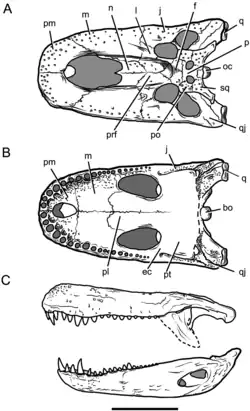 1. ^ Rio, Jonathan P.; Mannion, Philip D. (September 6, 2021). "Phylogenetic analysis of a new morphological dataset elucidates the evolutionary history of Crocodylia and resolves the long-standing gharial problem". PeerJ. 9 e12094. doi:10.7717/peerj.12094. PMC 8428266. PMID 34567843.
