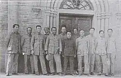 Delegates of the 6th plenary session of the 6th Central Committee of the Chinese Communist Party, including Mao Zedong (left end) and Zhou Enlai (right end), posing outside the church in 1938. The Romanesque Revival arch doorway is visible.