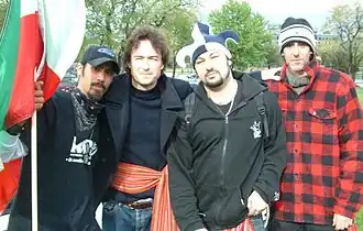 Prominent RRQ member Nick Demers with members of Loco Locass on National Patriots' Day.