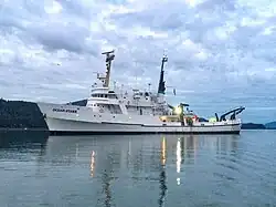 With her home port at Seattle, Ocean Starr is operated for Stabbart Maritime by Ocean Services, Inc. She operates in the Pacific Ocean, sometimes under charter to NOAA. Among other duties, she continues to conduct CalCOFI cruises,[8] and hosts teachers taking part in NOAA's Teacher at Sea program.[10] In May 2013, she conducted an annual National Marine Fisheries Service cruise along the United States West Coast to survey populations of ichthyoplankton, krill, jellyfish, squid, and other marine life.[11] On July 23, 2015, with the lead oceanographer for The Ocean Cleanup and 15 researchers and citizen scientists on board, she departed San Francisco, California, to operate as one of approximately 30 vessels that took part in the Mega Expedition, in which the vessels cruised in parallel across the Great Pacific Garbage Patch, covering 3,500,000 square kilometers (1,400,000 square miles) of the Pacific Ocean in an effort to collect more plastic samples in three weeks than had been collected in the previous 40 years combined.[12] In the autumn of 2015, she conducted a survey sponsored by the Government of Mexico of endangered vaquitas off the coast of Mexico.[13] In July 2017, United States Geological Survey scientists spent 21 days aboard Ocean Starr collecting imagery of the Queen Charlotte-Fairweather Fault System off southeastern Alaska.[14]