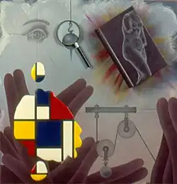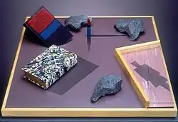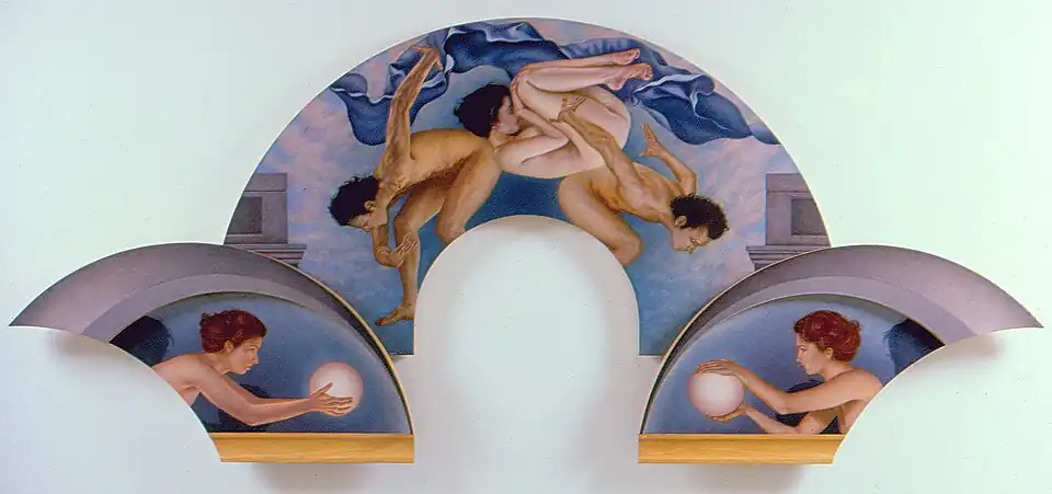 Lavender’s work displayed stylistic evolution over the years. Early works, featured in Newcomers '79 at Los Angeles' Municipal Art Gallery, were painted figurative tableaux blending two-dimensional imagery with three-dimensional form, and including "sculptural objects that combined contrasting materials."[12] His 1981 move to Vanderbilt began "a crucial time of reevaluation and reexamination in his artistic development ... [and] an integration in his work," as he shifted to mixed-media tableaux and pictorial works with reliefs, in “an overall dissolution of media boundaries."[9] One critic saw the pieces as "psychological dramas in which … ideas are realized through a variety of media ... [that] allude to the diversity of human nature ...."[13] The work included three series of sculptural and pictorial tableaux: Frames of Mind explored the five stages of grief discussed by Elisabeth Kübler-Ross. Conflicting Ideals focused on four systems of idealization—art, nature, science and technology.[14] An unnamed series set the international symbols for Man and Woman in unexpected scenarios.