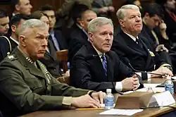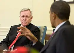 In 2008 Mabus campaigned for Democratic presidential candidate Barack Obama in Mississippi, who was subsequently elected President of the United States.[81] On March 27, 2009, Mabus was nominated by Obama to be appointed Secretary of the Navy.[82] He was sworn in on May 19, 2009,[83] and held a ceremonial swearing in at Washington Navy Yard on June 18, 2009, where he was re-sworn in by the Secretary of Defense Robert Gates.[84][85][86]
