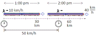 We begin with relative motion in the classical, (or non-relativistic, or the Newtonian approximation) that all speeds are much less than the speed of light. This limit is associated with the Galilean transformation. The figure shows a man on top of a train, at the back edge. At 1:00 pm he begins to walk forward at a walking speed of 10 km/h (kilometers per hour). The train is moving at 40 km/h. The figure depicts the man and train at two different times: first, when the journey began, and also one hour later at 2:00 pm. The figure suggests that the man is 50 km from the starting point after having traveled (by walking and by train) for one hour. This, by definition, is 50 km/h, which suggests that the prescription for calculating relative velocity in this fashion is to add the two velocities.