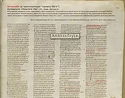 ![]() The Greek text of Revelation 19 in Codex Sinaiticus (British Library, Add. 43725; from 4th century AD). The term "hallelujah" (in Greek majuscule: ἈΛΛΗΛΟΎΪΑ) occurs 4 times in this chapter (Revelation 19:1,3,4,6) as highlighted in red frames. | |