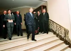 In June 2005, Serhiy Kornich, then head of the Interior Ministry's economic crimes department, stated publicly that Akhmetov was "the head of [an] organized crime group."[44] That year, Borys Kolesnikov, a friend and associate who had been tied to Akhmetov since the 1980s, was arrested on charges of extortion and conspiracy to assassinate a rival Donetsk businessman.[41] Charges against Akhmetov and Kolesnikov were dropped in 2006 amid a significant rise in political power by the former,[41] and the cooperation of the Yuschenko government,[43] ending Akhmetov's exile.